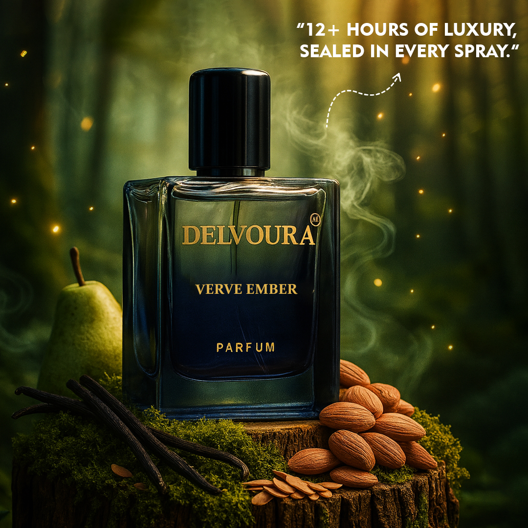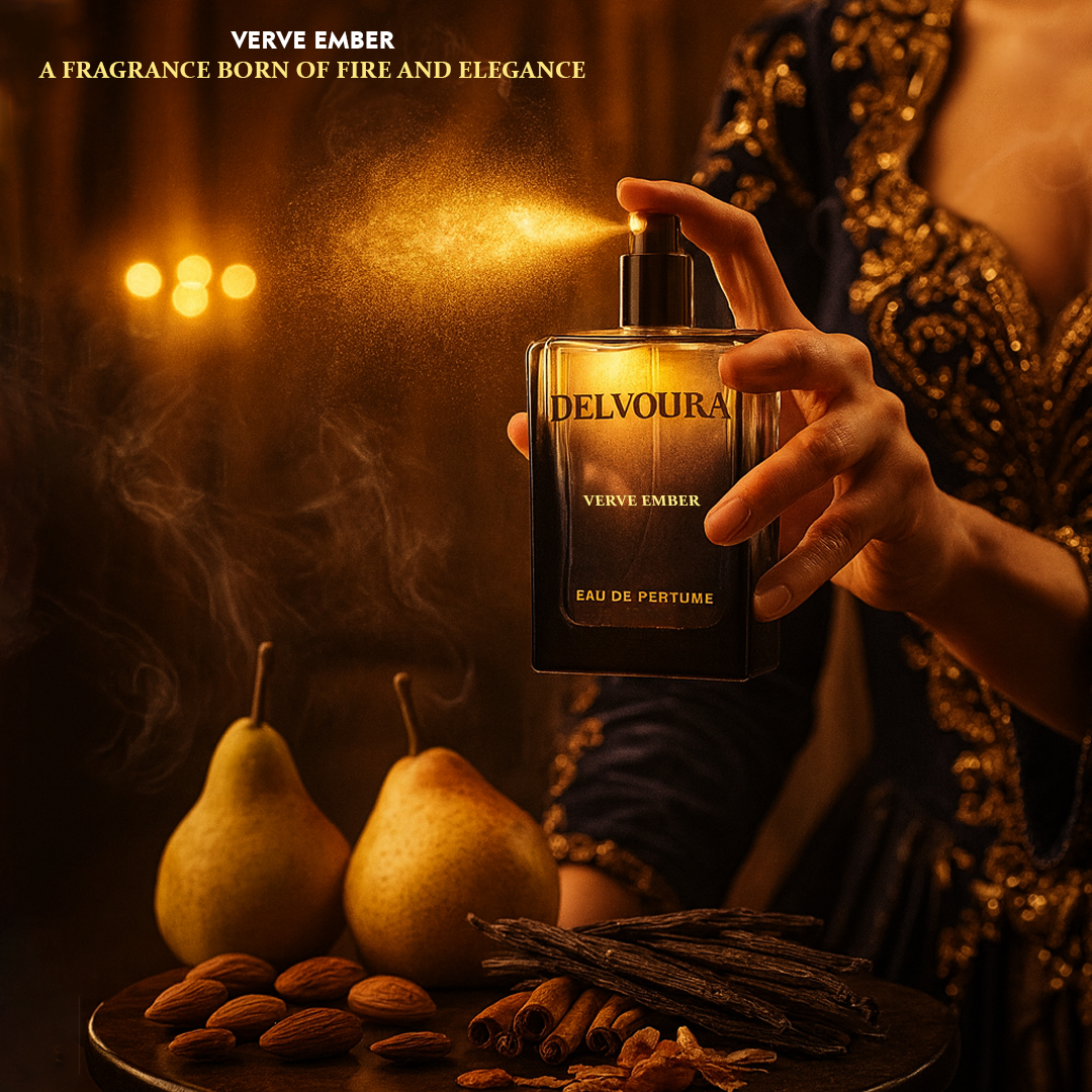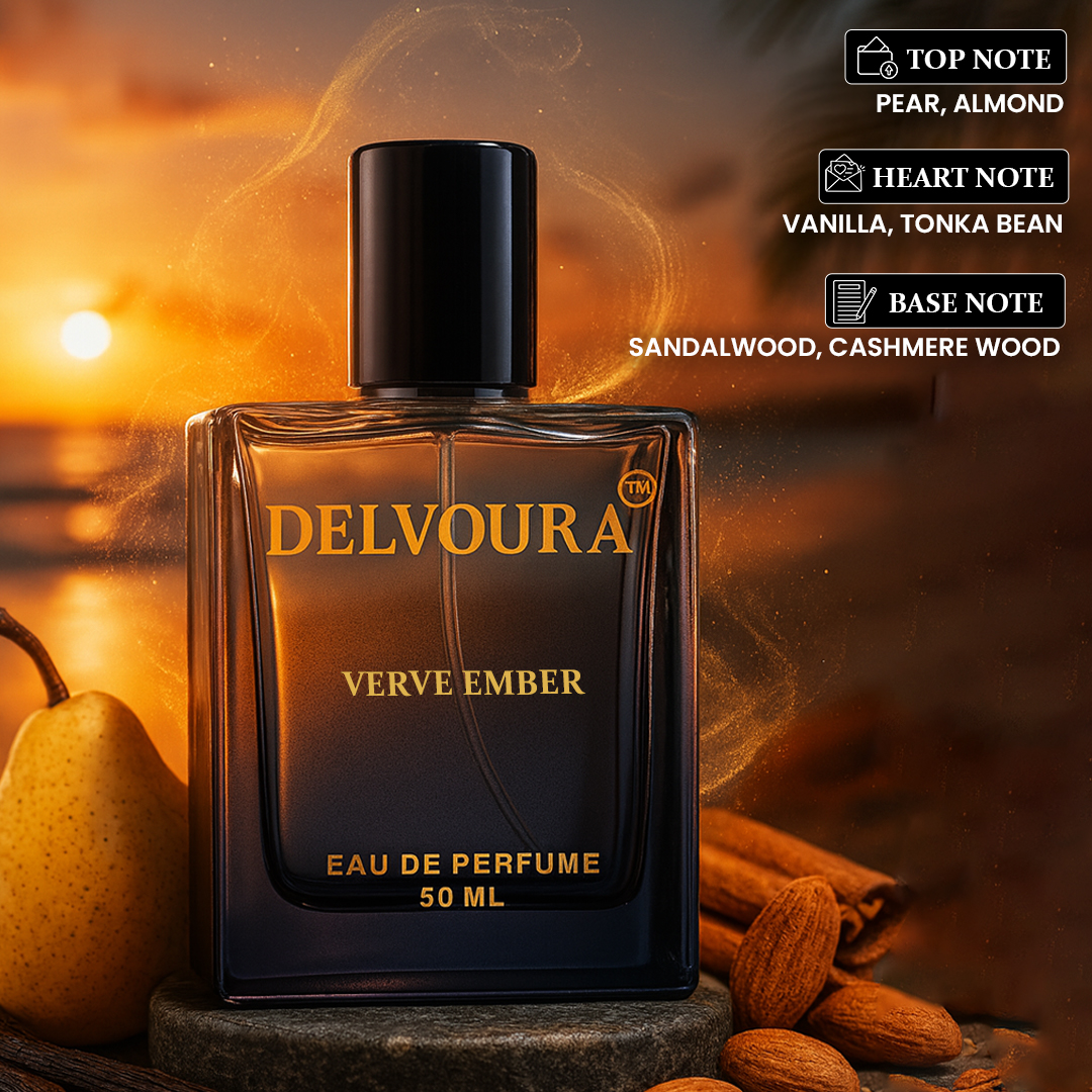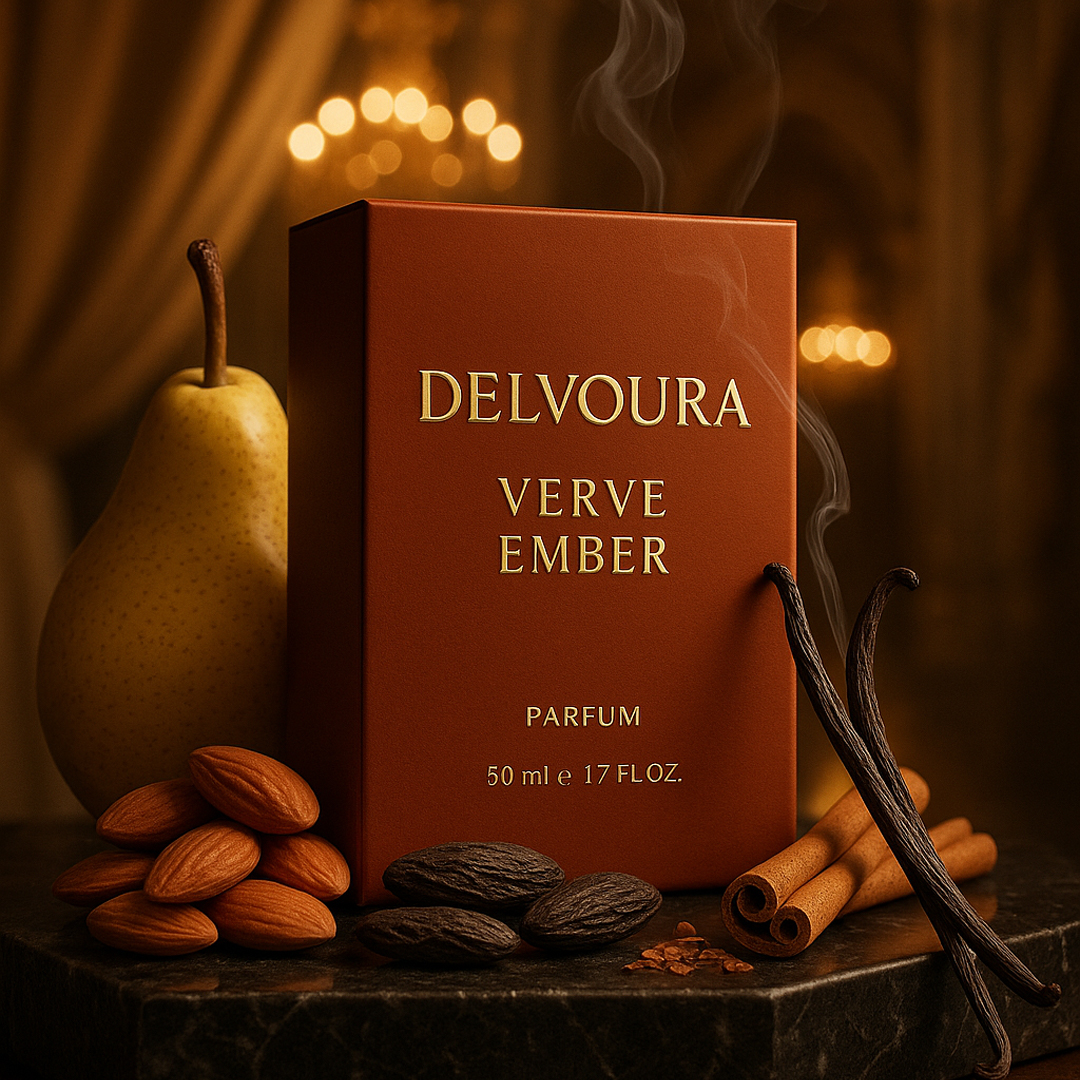 Indulge in the comforting charm of Verve Ember, a gourmand creation from Delvoura’s Verve Series designed for men who appreciate refined sweetness. The fragrance opens with the succulent freshness of pear and the delicate nuttiness of almond, leading into a heart of creamy vanilla and rich tonka bean. The base unfolds with smooth sandalwood and luxurious cashmere wood, creating a scent that feels both comforting and sophisticated.
