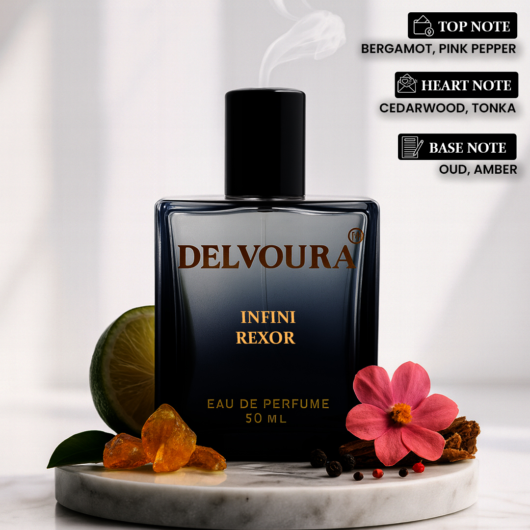 Celebrate life’s grand moments with Infini Rexor, a unisex fragrance from Delvoura’s Infini Series designed for professional elegance and festive charm. It opens with the bright, citrusy sparkle of bergamot and the lively warmth of pink pepper, creating an instant mood of joy. The heart unfolds with cedarwood and creamy tonka, adding depth and sophistication. The base of oud and amber radiates rich, golden warmth, perfect for occasions filled with light, tradition, and togetherness.