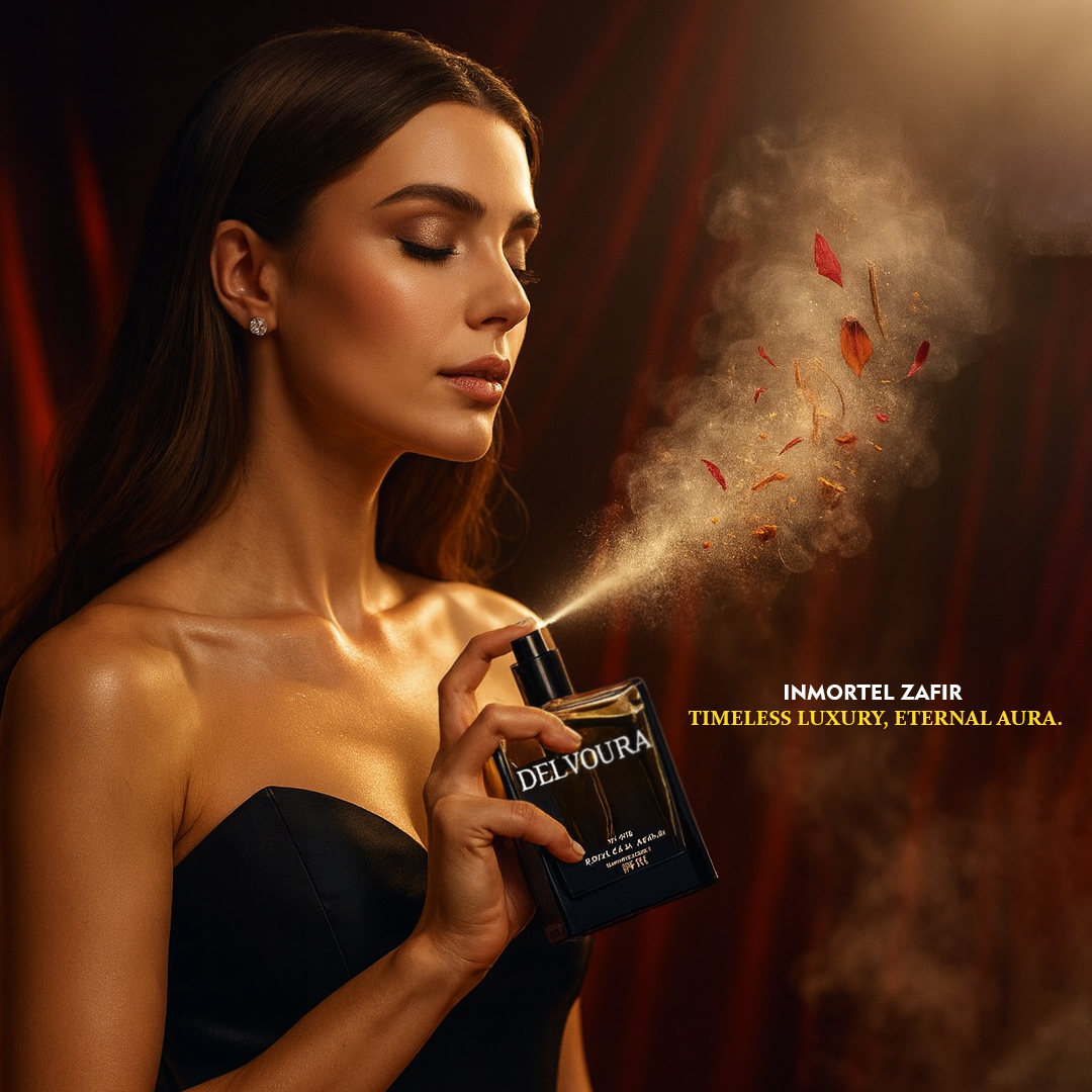 Inmortel Zafir from Delvoura’s Inmortel Series is a tribute to classic oriental elegance. Opening with the golden warmth of saffron and the romantic depth of rose, it unfolds into a heart of smooth vanilla enriched with smoky incense. The base of oud and amber delivers a rich, resinous finish that lingers with regal sophistication.